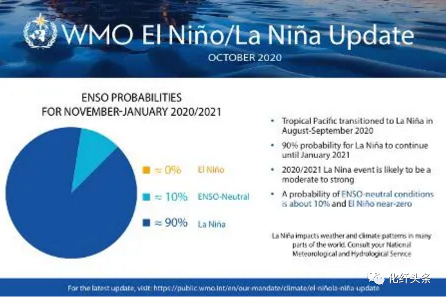 看天吃飯的內貿市場難了:說好的寒冬不來了!2020年仍將是有記錄以來最溫暖的年份之一?10月29日,世界氣象組織發布新版《全球季節性氣候更新》指出,拉尼娜現象已經形成,預計今年的拉尼娜現象強度為中等到強,并將持續至明年,影響世界諸多地區的溫度、降水和風暴型式。拉尼娜現象是指赤道太平洋中部和東部海洋表面溫度的大尺度降溫,并伴有熱帶大氣環流(即風、氣壓和降雨量)的變化。它對天氣和氣候的影響通常與厄爾尼諾現象相反。世界氣象組織該最新季節性氣候預報顯示,熱帶太平洋海面溫度在2020年年底之前很可能(有90%可能性)保持在拉尼娜水平,并可能持續到2021年第一季度(有55%可能性)。與2020年拉尼娜事件相關的最顯著降水異常將發生在:大非洲之角和中亞地區降雨量低于正常水平,而東南亞、太平洋部分島嶼和南美洲北部地區降雨量則高于正常水平。世界氣象組織指出,需要注意的是,厄爾尼諾現象和拉尼娜現象并非推動全球和區域氣候發展的唯一因素。每次拉尼娜或厄爾尼諾事件都是各不相同的,它們對區域氣候的影響可能因一年中的時間和其他因素而異。因此,決策者應時刻關注最新的季節性預報,以獲取最新信息。