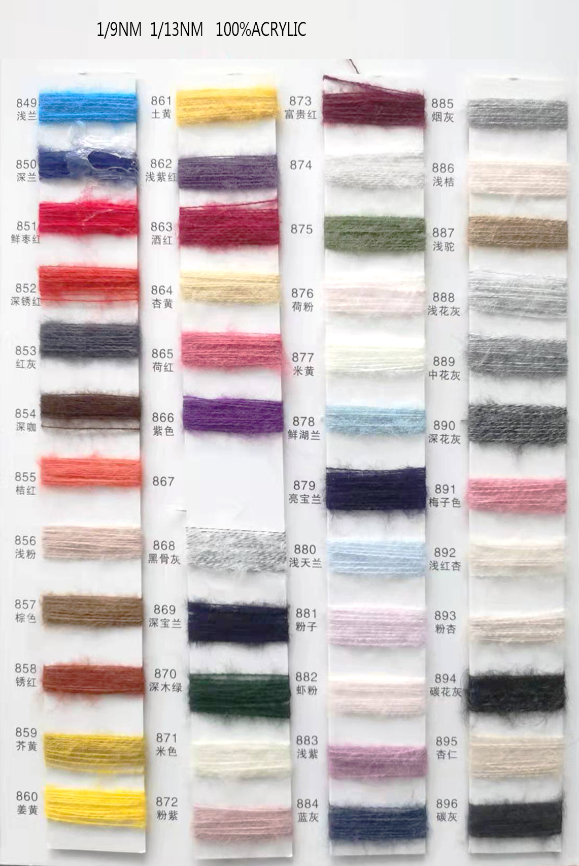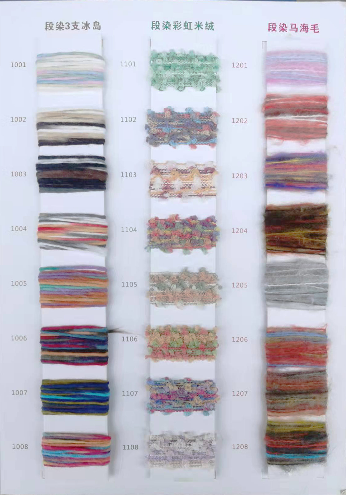春夏系列,秋冬系列美麗諾羊毛,巴素蘭五五毛,巴素蘭三七毛,絲光羊毛,山羊絨混紡,羊毛混紡,羊仔毛系列,巴素蘭防縮水羊毛,,兔絨紗,馬海毛,半精紡混紡紗,高捻包芯紗,仿亞麻,高端亞麗爽,絲光棉,夏爽絲,棉混紡系列,高捻棉系列,高比例馬海毛,中比例馬海毛,高比例羊駝毛。再生環何類紗線