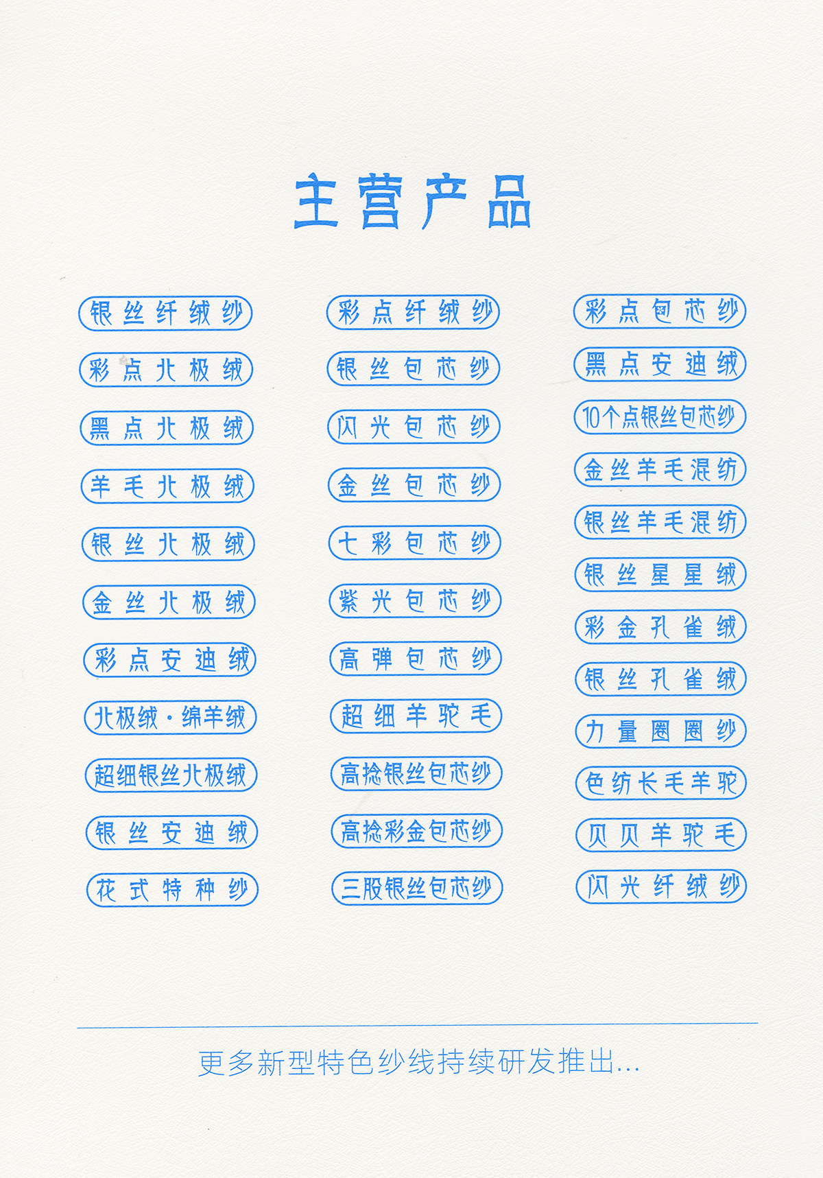 銀絲北極絨、金銀絲羊毛混紡、閃光包芯紗、銀絲包芯紗、金絲包芯紗、紫光包心紗、藍絲包芯紗、高捻銀絲包芯紗、高捻彩金包芯紗、3股銀絲包芯紗、羊毛圈圈紗、銀絲星星絨、彩點黑點北極絨、彩點安哥拉纖絨紗、銀絲安哥拉、閃光安哥拉、彩點黑點安迪絨高比例色紡馬海毛、高比例羊駝馬海毛毛、超細羊駝毛